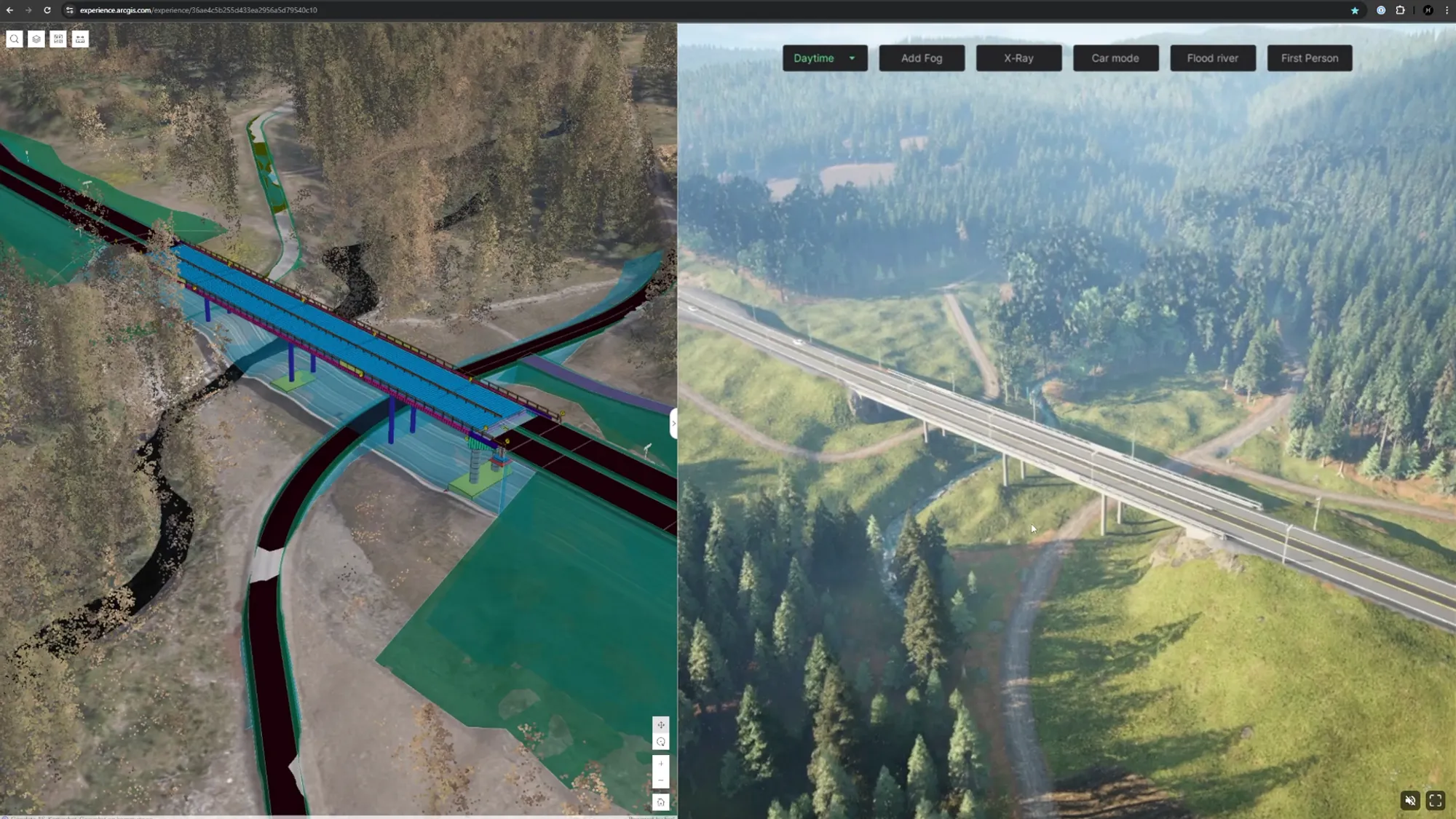 I GEOS går du fra modell til opplevelse: Her kan du hente opp BIM-modellene dine inn i et naturtro miljø og gjøre simuleringer på toppen av dette. f.eks. ved å vise flomscenarier.
