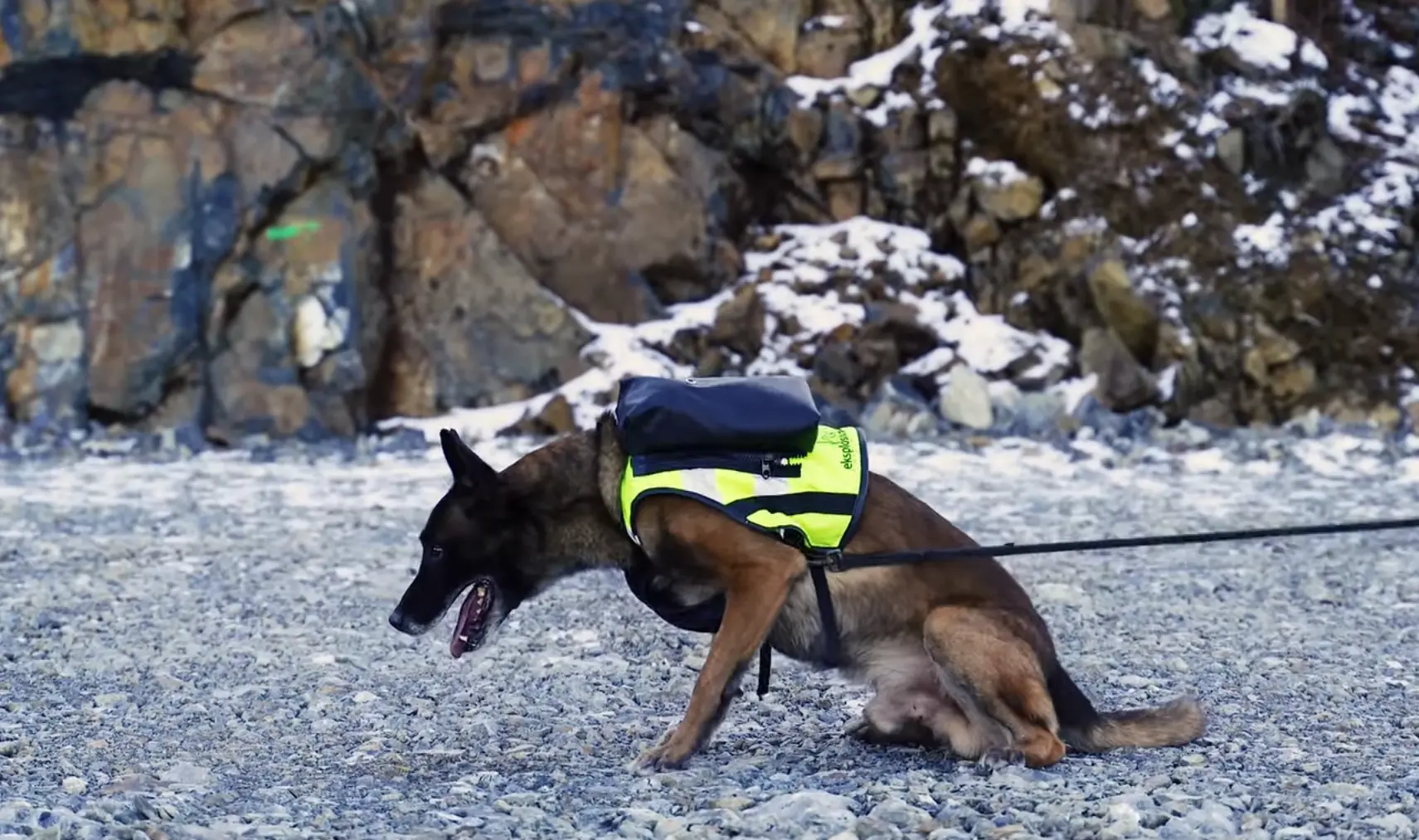 Her bruker Skanska søk med hund for å sikre at udetonerte eksplosiver ikke ligger igjen etter sprengningsarbeid. Hundens søk og markeringer blir registrert i appen, og dataene oppdateres direkte i kartsystemet.
